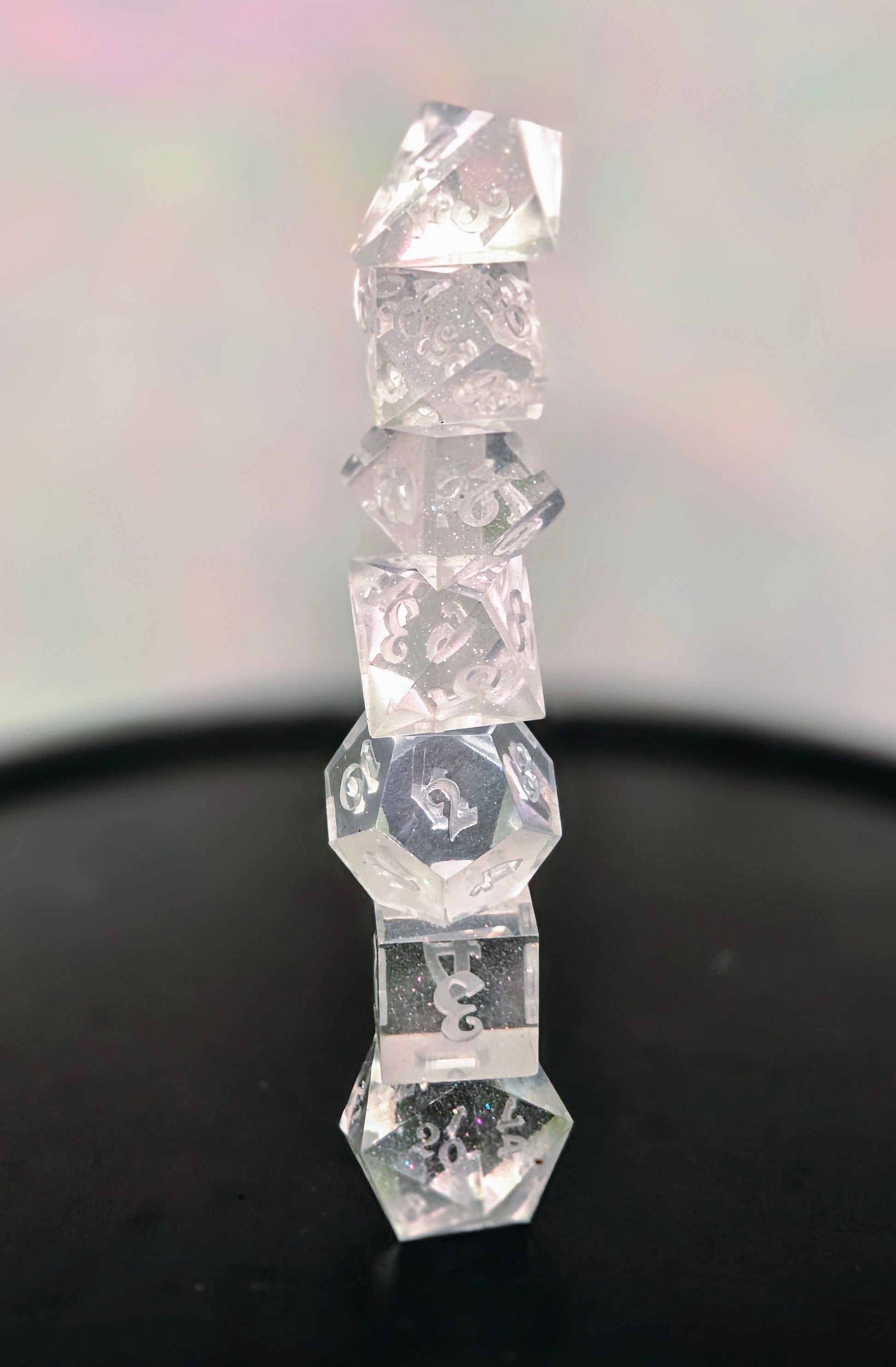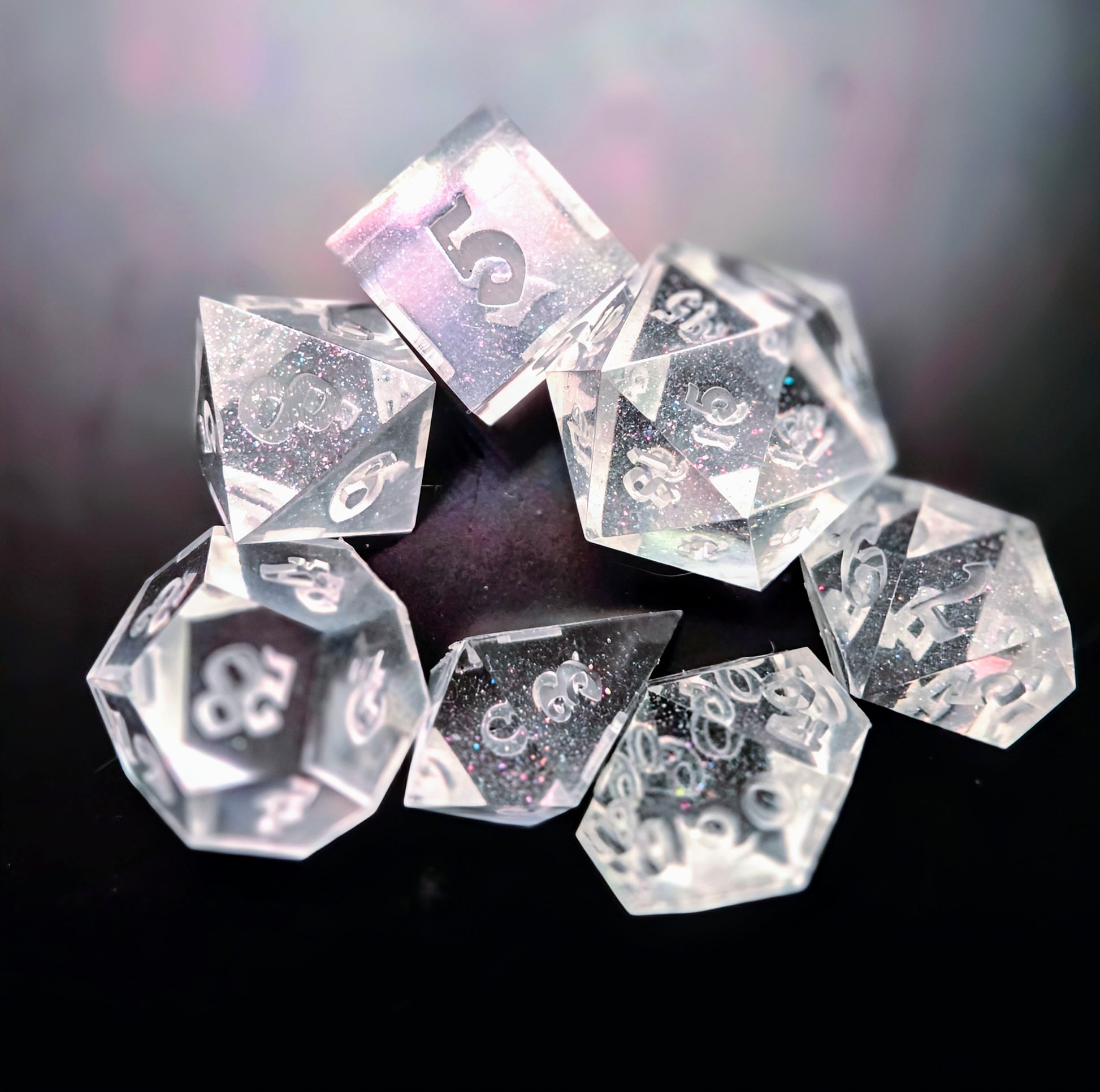 This beautiful, sparkling clear resin dice set is reminiscent of crystals.