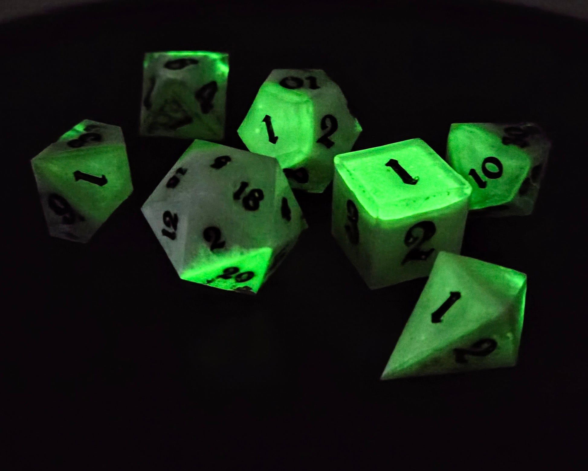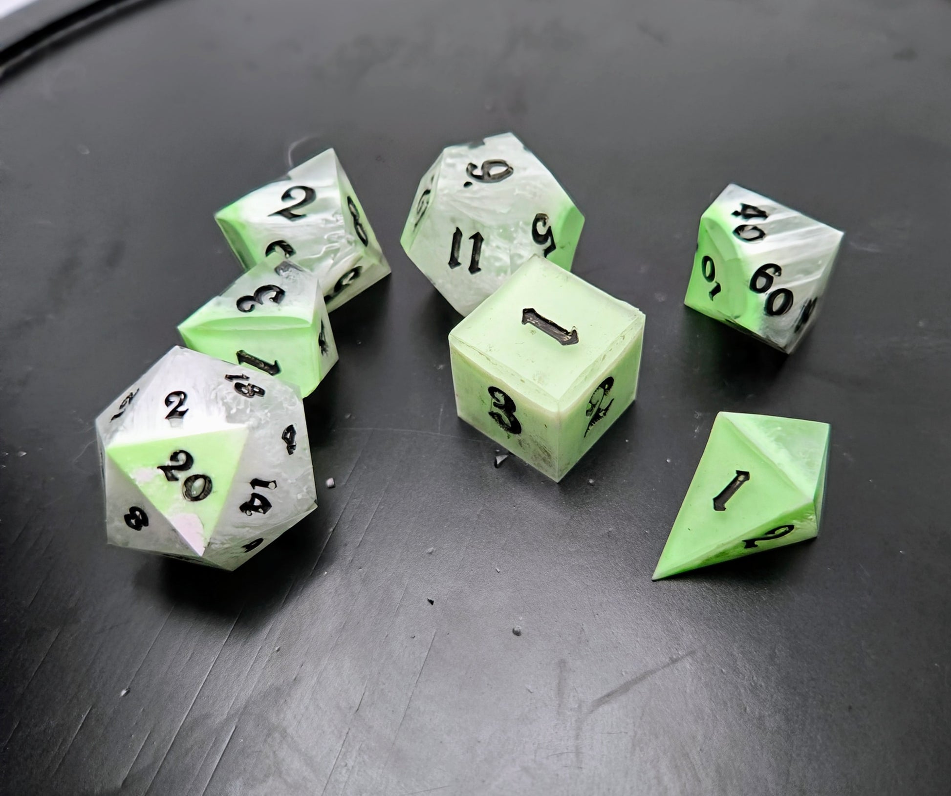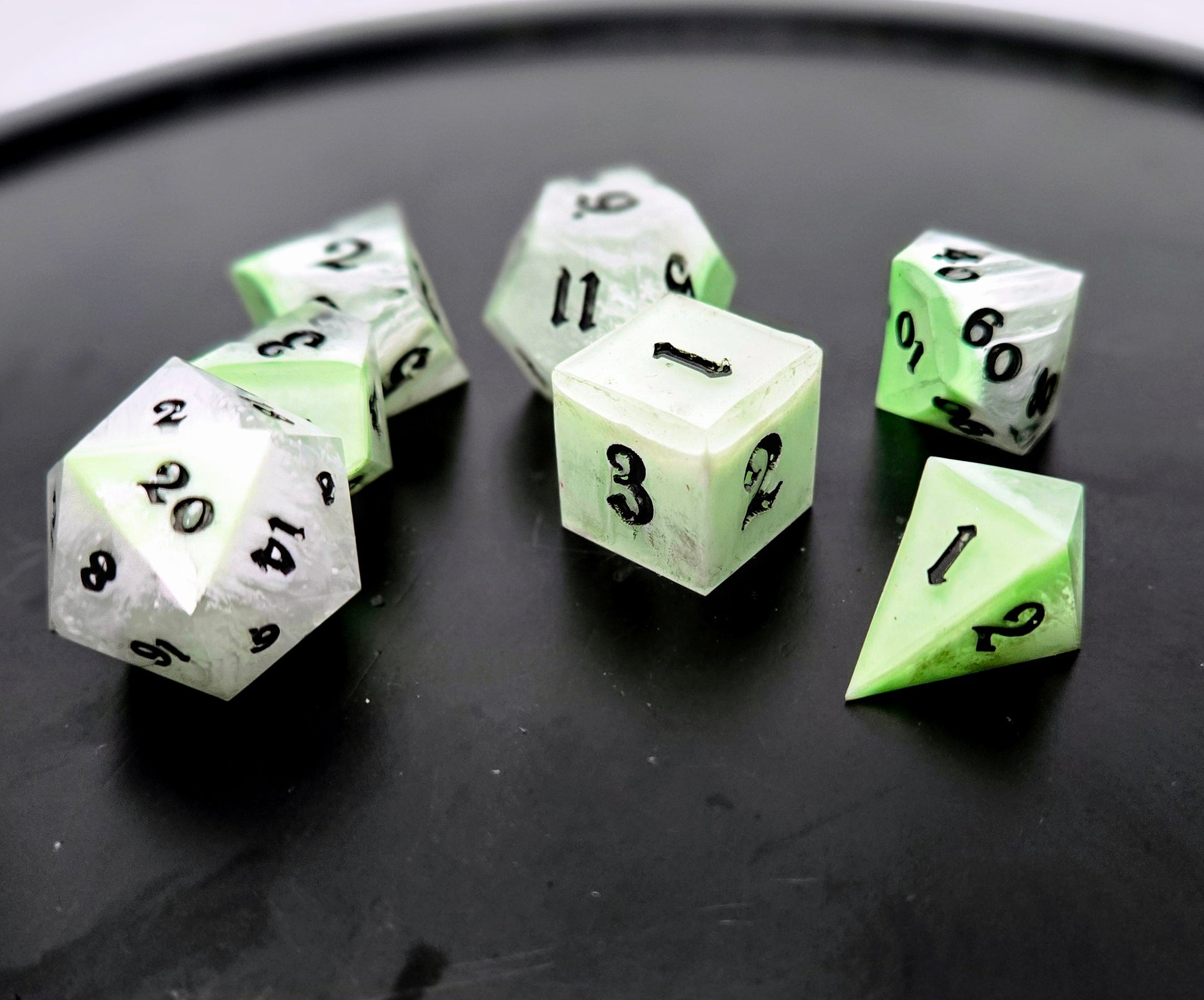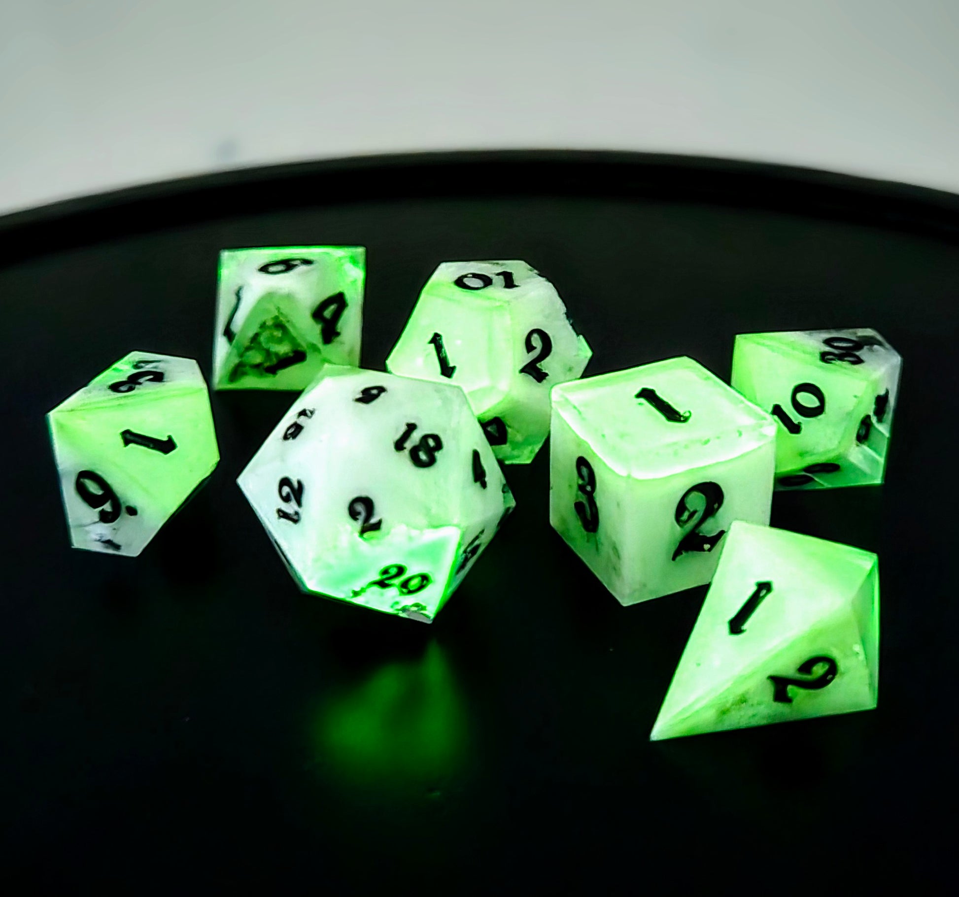 This dice set is inspired by historical contexts - for this, I was inspired by the Radium Girls of WWI and WWII. My grandmother was a Radium Girl in WWII who lived to tell the tale.
