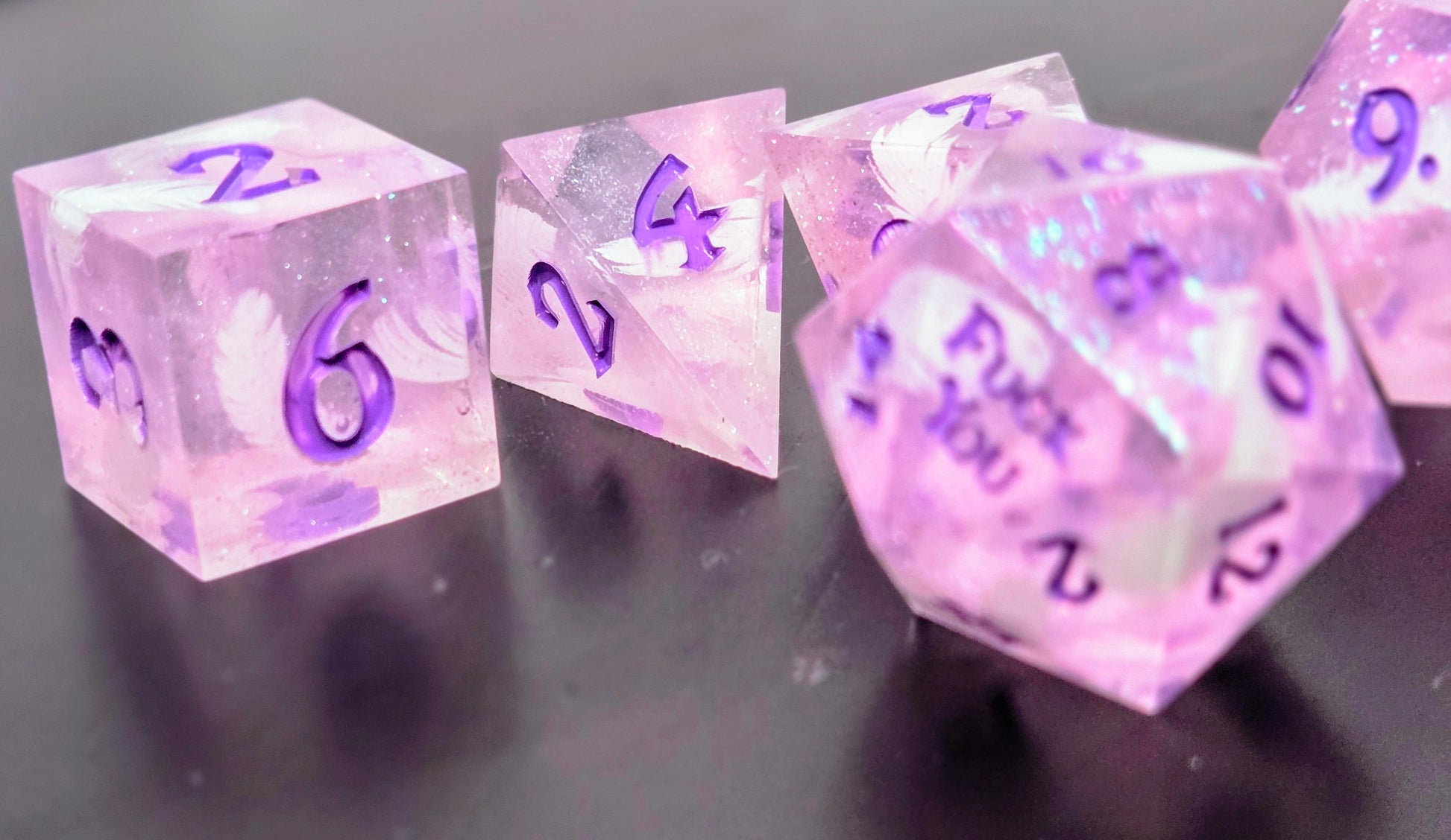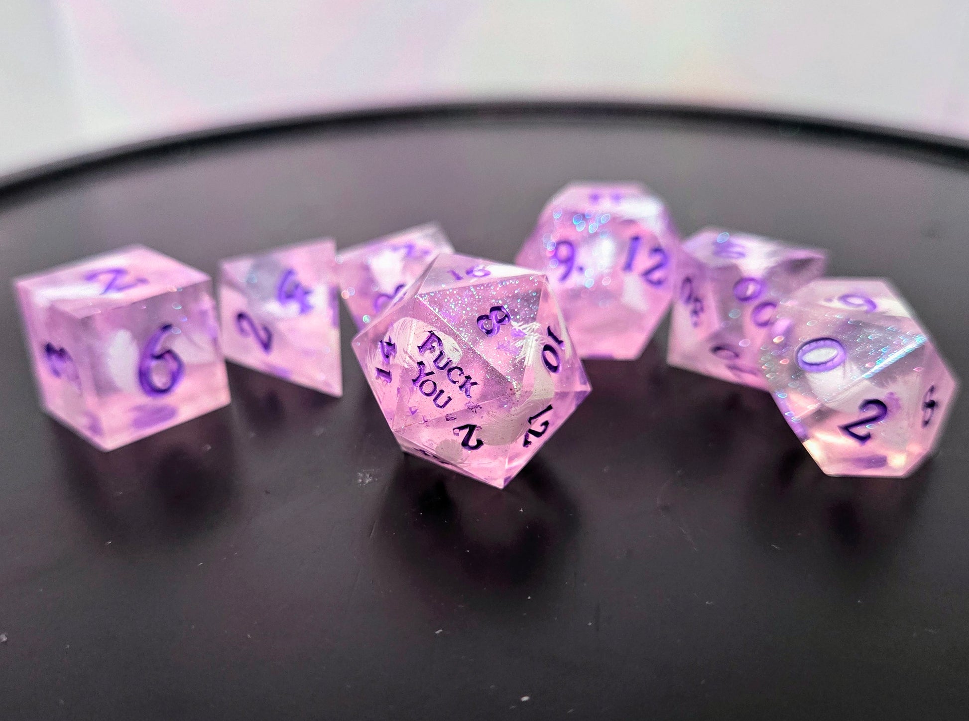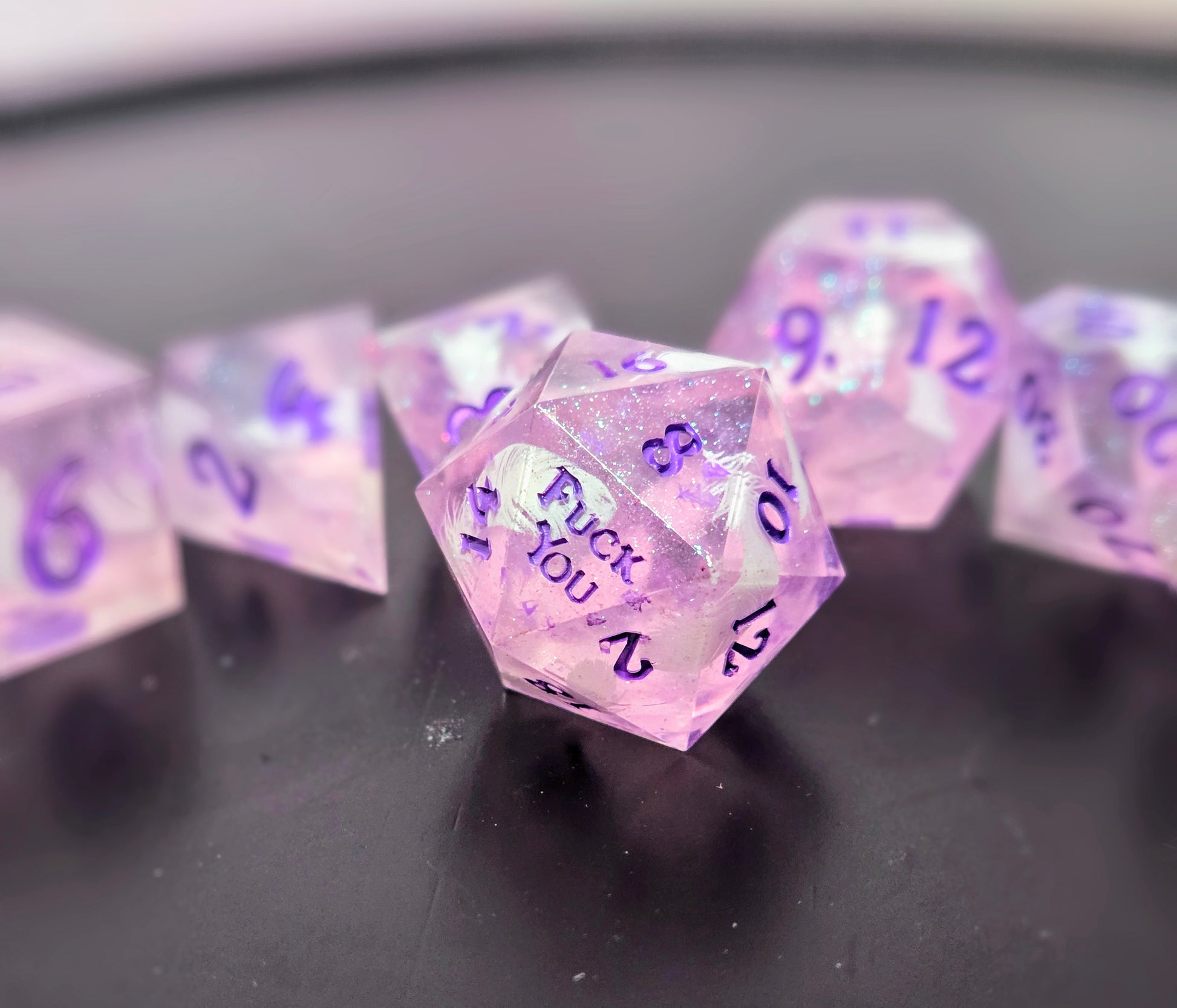 This beautiful dice set is perfect for your monk or any caster who is light on their feet! The 20 face says F*ck You, while the 1 face says F*ck Me.